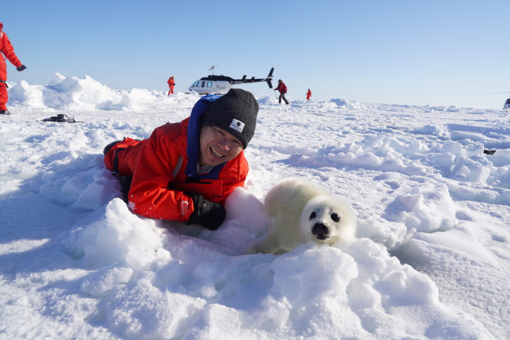 カナダ東部でたてごとあざらしの赤ちゃんと(Photo by 小原玲 2019)