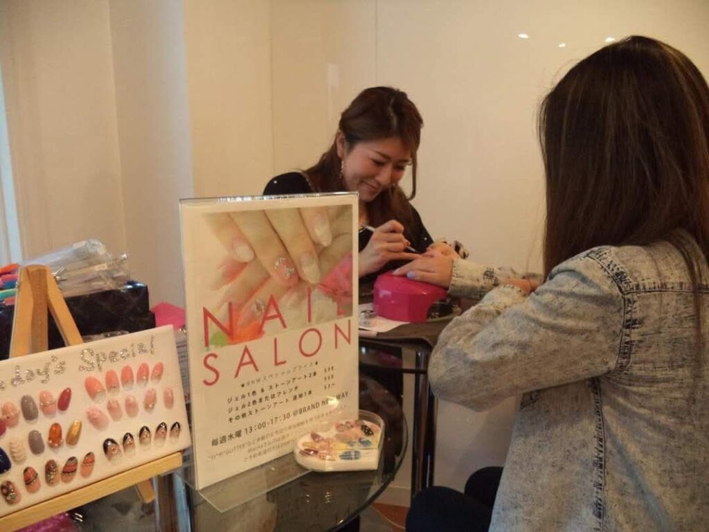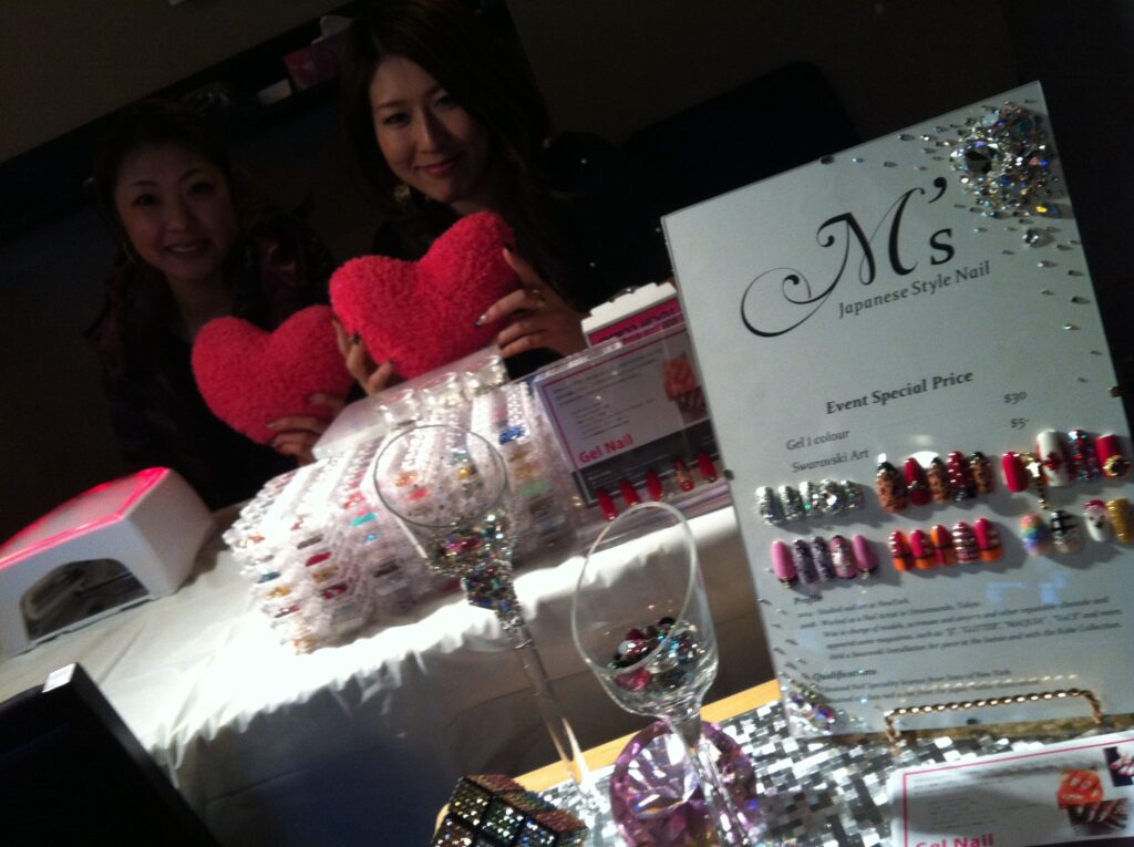 それこそワーホリの時に、 まだ起業する前の段階で、 ローカルのサロンでもやりつつ、 日本のジェルとか、こっちにはない可愛いネイルアートのパーツを自分は持ってきていたので、そういう自分スタイルのネイルもしたくて、 自分だけのお客様ができるように、出張ネイルってことで、 留学エージェントのオフィスの片隅をお借りして、 週に一回出張ネイルさせていただいたり、 クラブイベントとかで、 Barブースの一つに、そこだけ灯りを照らしてやったりと出張ネイルをして、「日本のネイルをしています」とやっていました。 そこからだんだん固定のお客様がついてくるようになって、お店をしっかり持たないといけないなということで、 ちゃんとサロンを開こうと思いました。